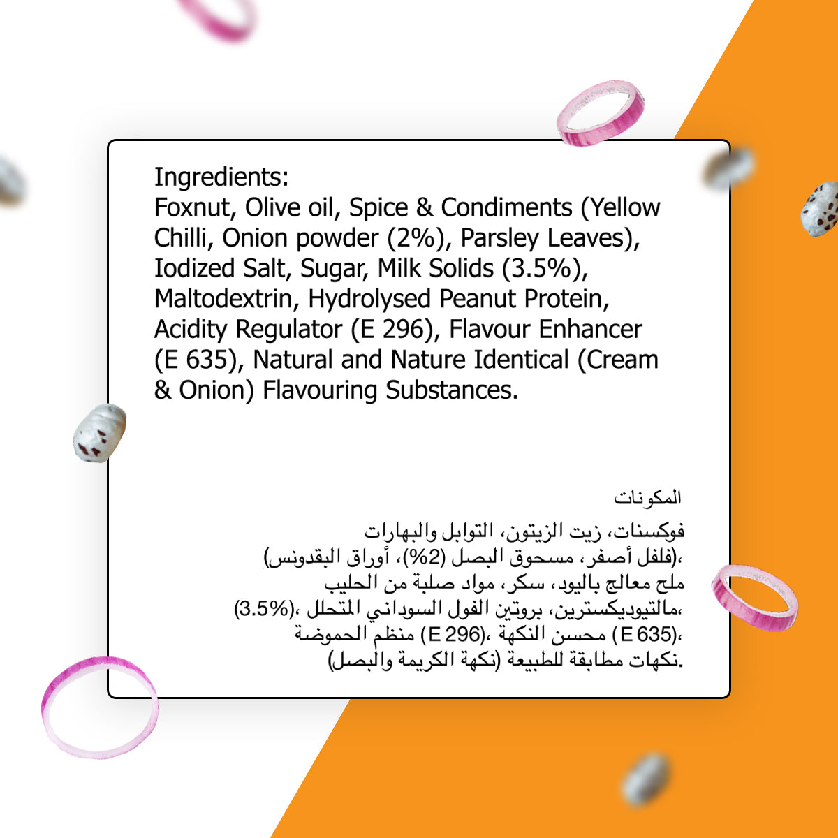 Indulge in the delightfully creamy and savory experience of our Cream and Onion Makhana (Fox Nuts). This flavor celebrates the perfect marriage of smooth, rich creaminess paired with the sharp, fresh zing of onion. Each bite offers a luscious, velvety texture that wraps around your palate, highlighting both the tang of garden-fresh onions and the mellow smoothness of cream.