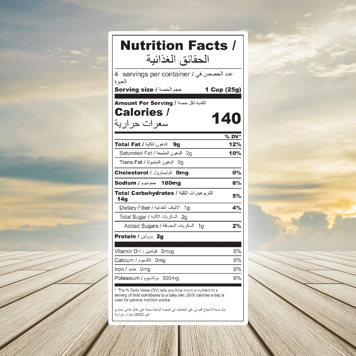 Per serving: 140 calories, 9 g total fat, 2 g saturated fat, 0 g trans fat, 0 mg cholesterol, 180 mg sodium, 14 g carbohydrates, 2 g total sugars (including added sugars), 1 g dietary fibre, 2 g protein, 300 mg potassium.
