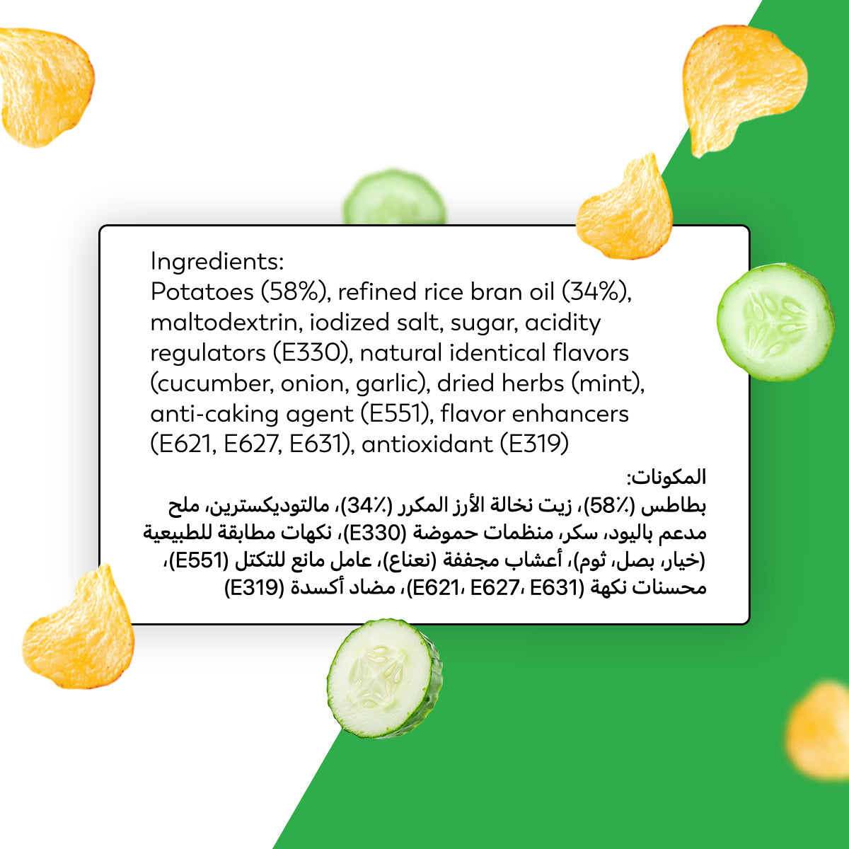 Ingredients: Potatoes (58%), refined rice bran oil (34%), maltodextrin, iodized salt, sugar, acidity regulators (E330), natural identical flavours (cucumber, onion, garlic), dried herbs (mint), anti‑caking agent (E551), flavour enhancers (E621, E627, E631), antioxidant (E319).