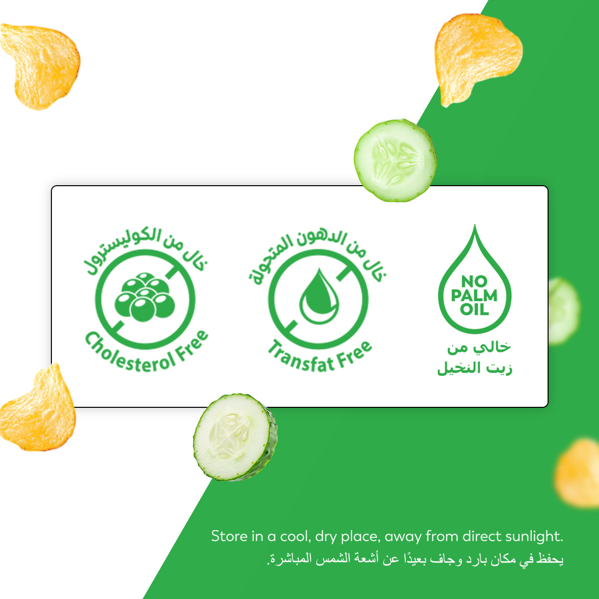 Zaxz Cool Cucumber flavoured Potato Chips deliver a refreshing twist on classic potato crisps with a light, cool cucumber flavour. Carefully selected potatoes are cooked in refined rice bran oil, then seasoned with natural identical cucumber, onion, and garlic flavours, dried herbs like mint, and a touch of sweetness for a crisp, garden‑fresh taste.