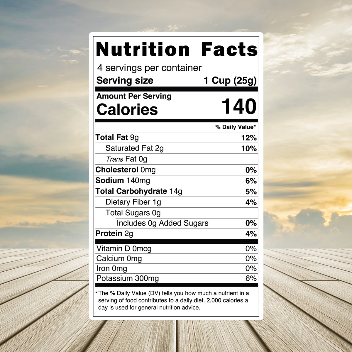 Per serving: 140 calories, 9 g total fat, 2 g saturated fat, 0 g trans fat, 0 mg cholesterol, 140 mg sodium, 14 g carbohydrates, 0 g sugars, 0 g dietary fibre, 2 g protein