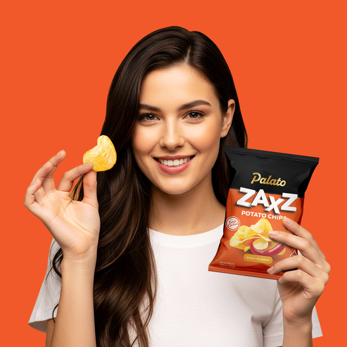 Zaxz Mild Chilli Flavoured Potato Chips bring you a gentle kick of heat without overwhelming your taste buds. Thinly sliced potatoes are cooked in refined rice bran oil and coated with a balanced blend of red chilli, onion, garlic, black pepper, and coriander for a warm, savoury flavour.